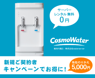 知名度抜群の「コスモウォーター」は、レンタル料・送料すべて無料で始められる天然水ウォーターサーバー。乗り換えや紹介で5,000円キャッシュバック、さらに毎月抽選で500名にプレゼントも!ボトル交換がラクな「らく楽スタイルsmart」や、こたつにも置けるショートタイプなど、ライフスタイルに合わせて選べる2種のサーバーを展開。若年層からシニアまで幅広く支持される、便利でお得なウォーターサーバーです。